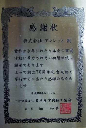 一般社団法人日本産業機械工業会より、創立70周年記念式典(平成30年5月17日)で永年功労会員へ佃和会長様より当社にも感謝状と70年のあゆみ(1948~2018年)が贈呈されました。