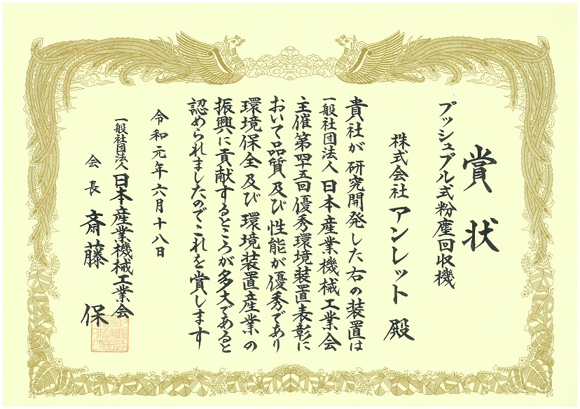 プッシュプル式粉塵回収機が、第45回優秀環境装置表彰で「日本産業機械工業会 会長賞」を受賞しました。