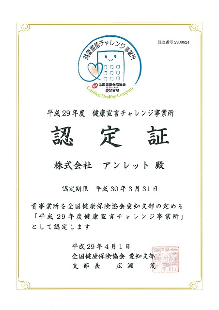 「平成29年度健康宣言チャレンジ事業所」に認定されました。